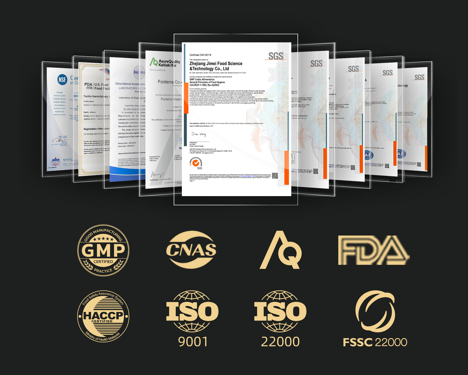 cGMP, FSSC22000, HACCP, ISO9001, ISO22000, CNAS, ect.